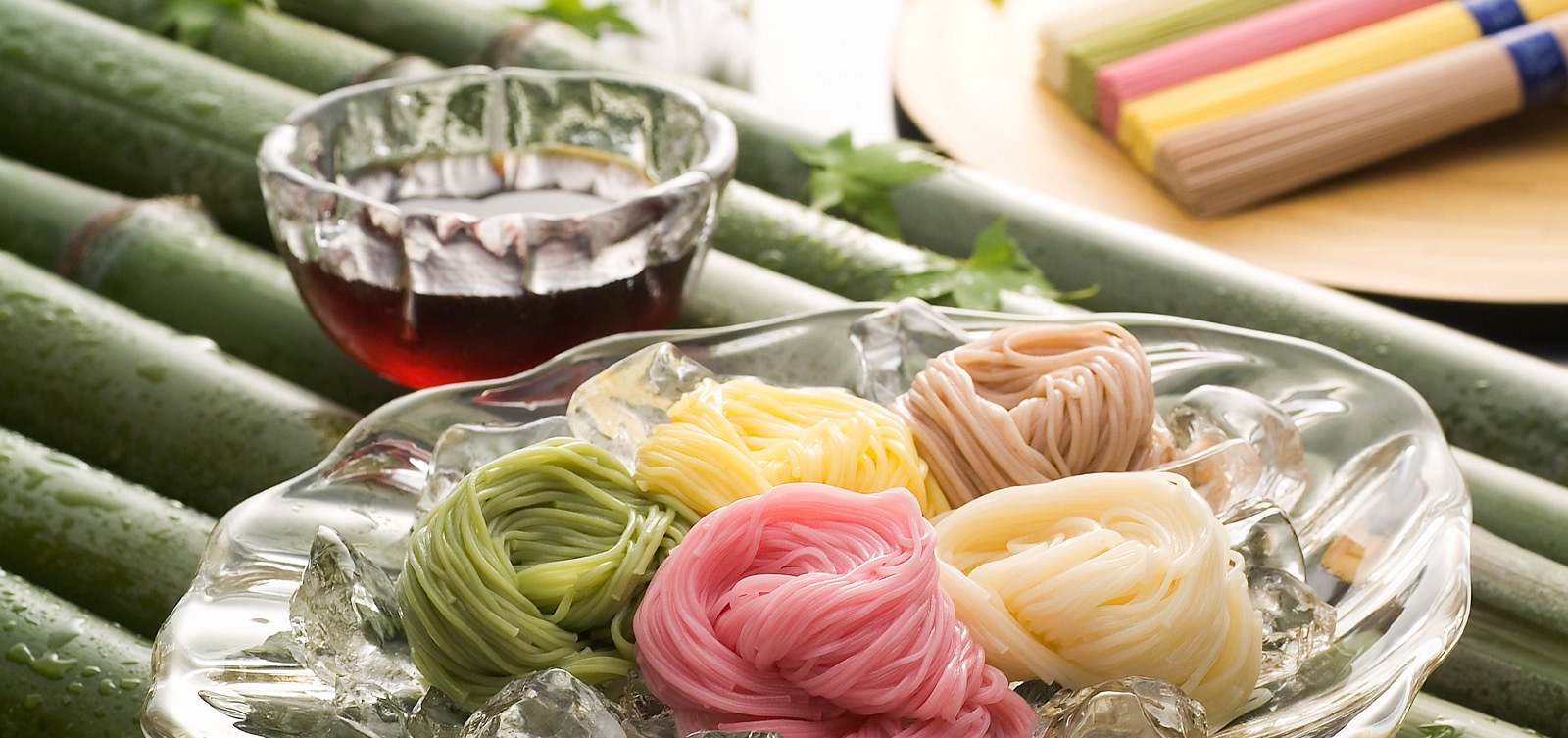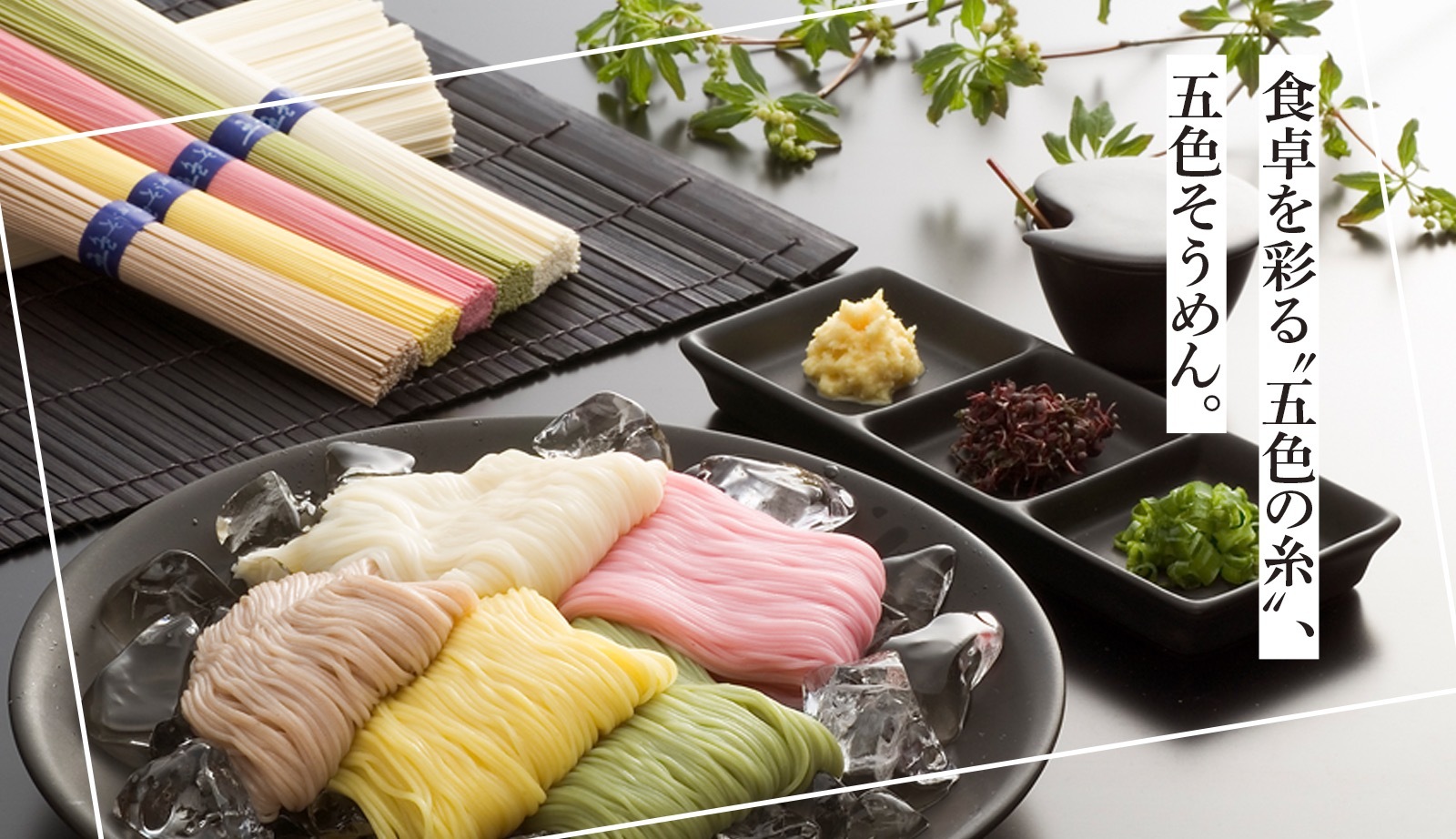 顏色來源為梅肉和抹茶等天然材料,手工揉製的麵線,製作方法其實相當困難,「五色麵線」經由職人們長年累月的研究,研發出增加麵條筋性所製作而成。