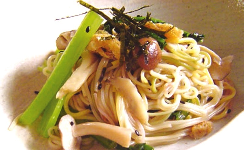 ⑥放入一小匙芝麻油在⑤上,將五色麵線放入鍋中快速炒過,熄火,放入海苔、黑芝麻、鰹魚片之後,盛放食器中即完成
