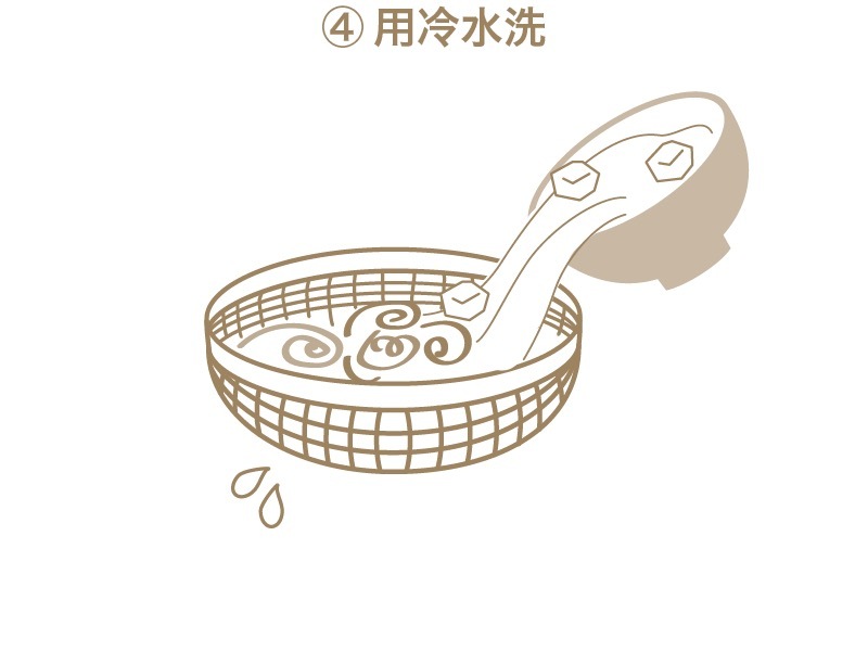 ④煮好的麵線撈起放入濾網,用冷水冷卻且洗去黏性。