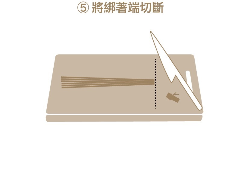 ⑤麵線濾乾水分後就能夠將綁著風箏線那端切斷。