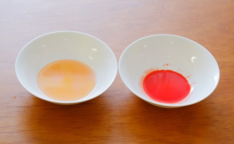 ③準備小碗倒入2大匙寒天液,再加入調配好的食用色素水仔細拌勻。