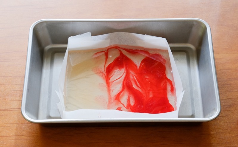 ④剩下的寒天液倒入折好的容器,然後再倒入上色的寒天液,用竹籤等畫出圖樣。