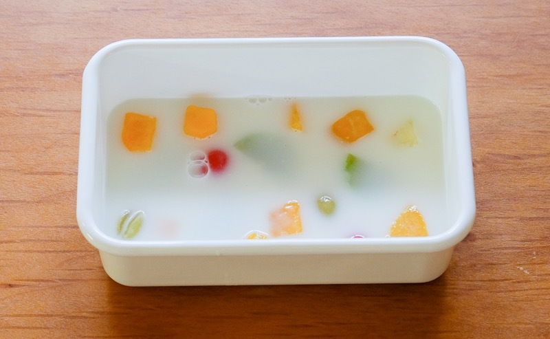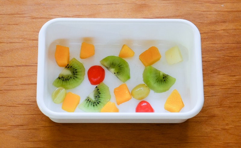④容器底部鋪上水果,再倒入稍微放涼的寒天液淹過水果。然後放涼使其凝固。