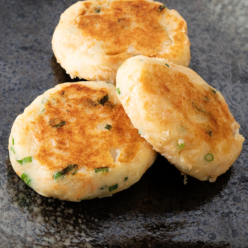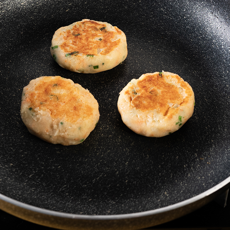 平底鍋熱鍋後,將馬鈴薯泥煎至兩面金黃色即可。