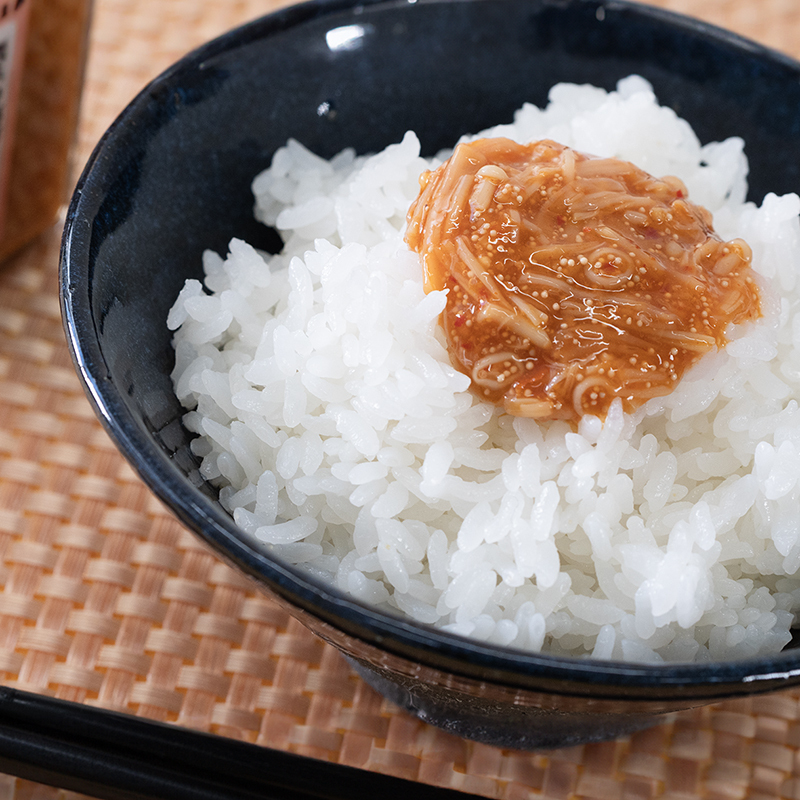 長野縣名產的新鮮金針菇搭配明太子所製成的拌飯醬!金針菇滑順股溜的口感加上微辣的明太子以及隱藏的韓式醬料風味,讓人一吃就上癮。