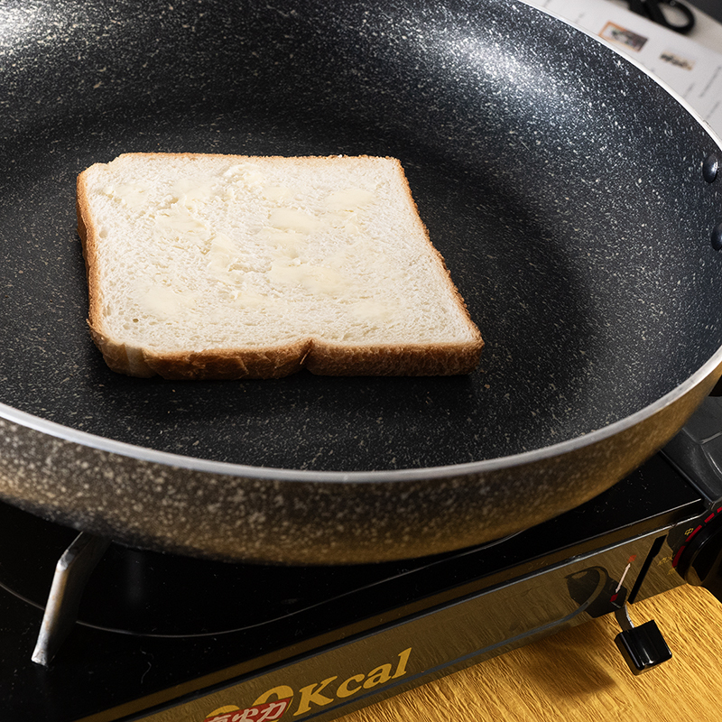 沒有烤箱也可以完成!平底鍋熱鍋,將吐司塗上一層奶油。