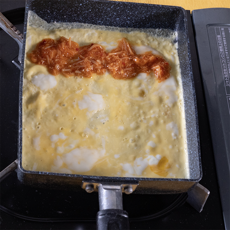 平底鍋熱鍋後,轉小火倒入第一層薄薄的蛋液,加入拌飯醬後慢慢捲起來。