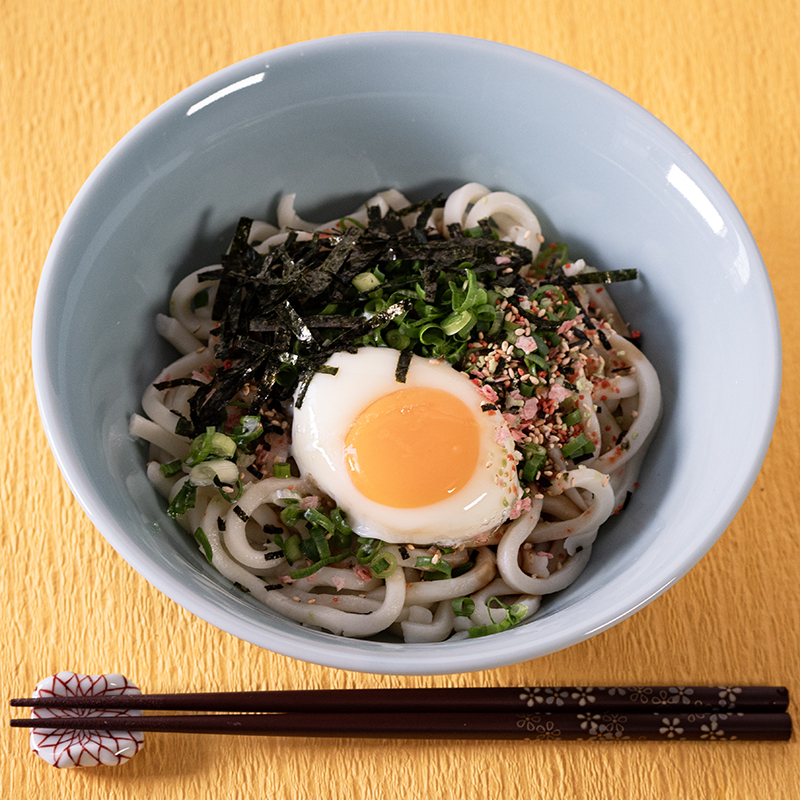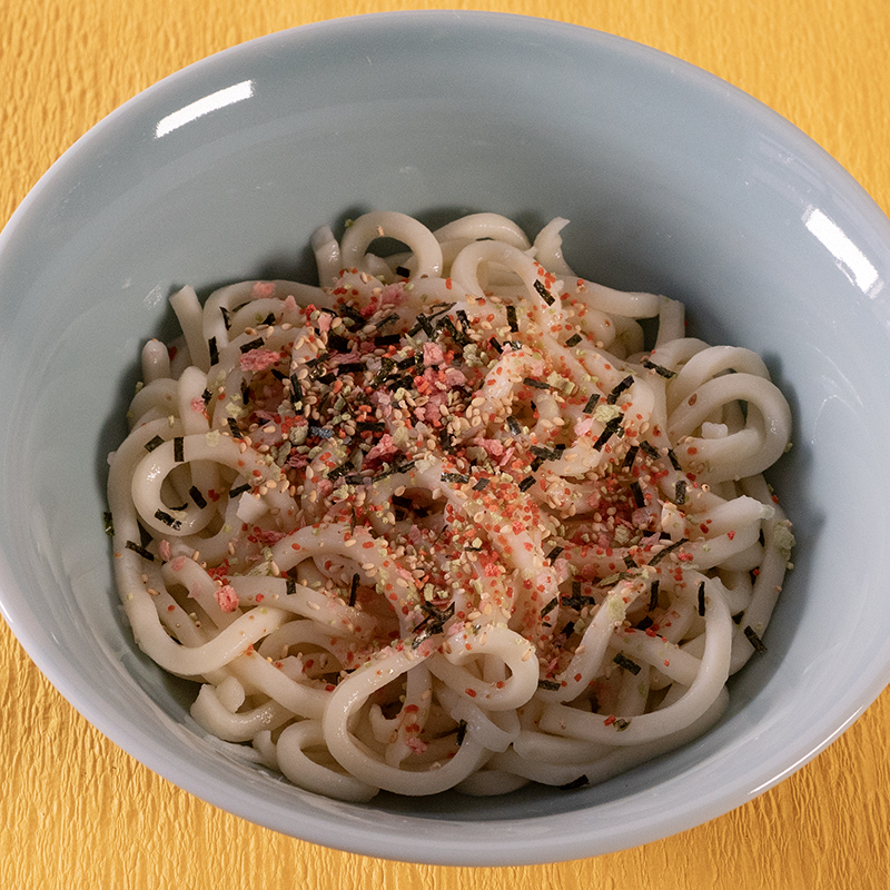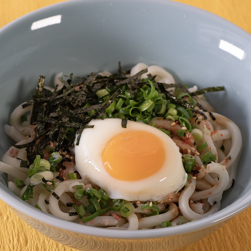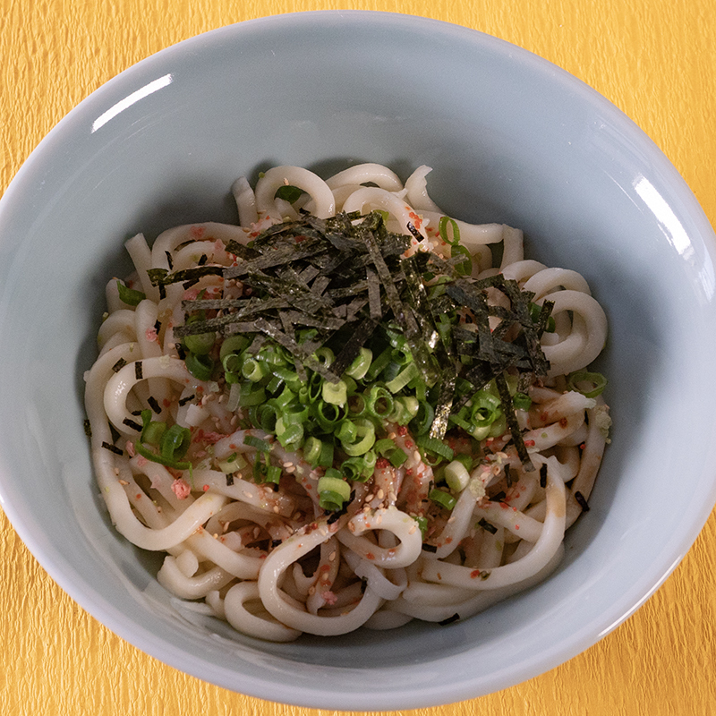 準備一個碗,把解凍的烏龍麵鋪底,加 入明太子香鬆、醬油,或其他喜好的調味醬。