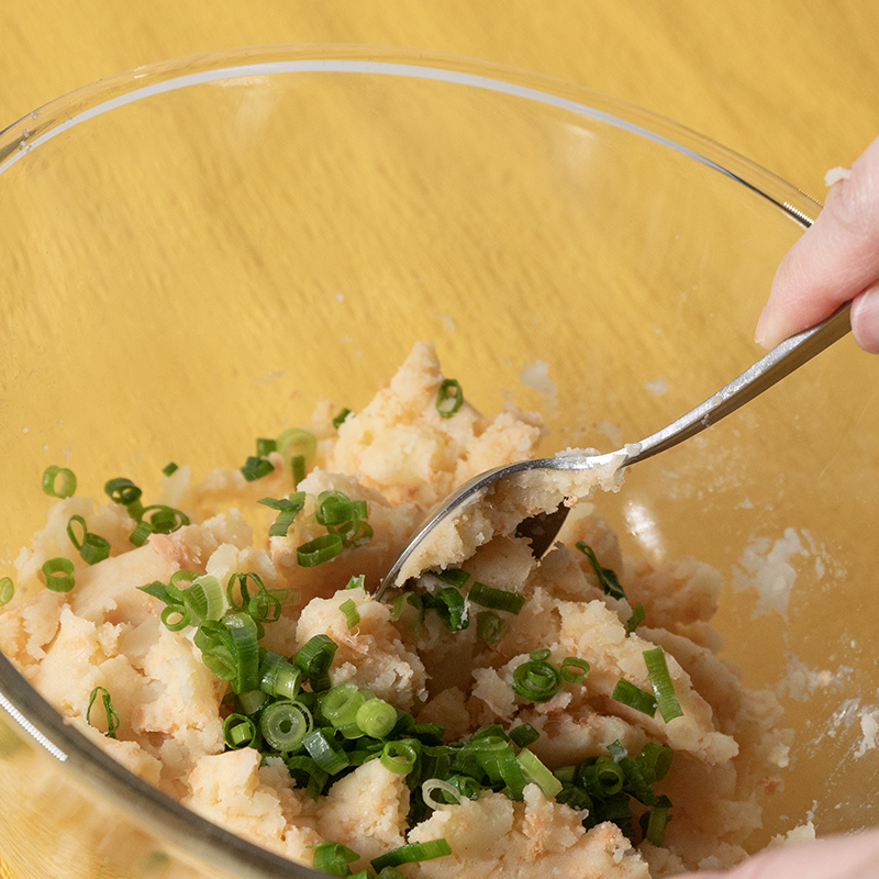 將其他材料混進去馬鈴薯泥,並充分攪拌。