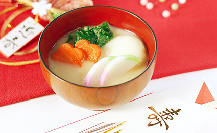 「雜煮」的起源於何時和哪時開始,無法確認。從一些文獻之中「雜煮」兩個文字出現於14世紀左右。聽說是武士們在慶宴喝酒時的佳餚。稻穂國度日本,年糕宛如神明駐駕之神聖的食物,山珍海味的食材一起放入鍋子燉煮成為喜氣料理的「雜煮」。