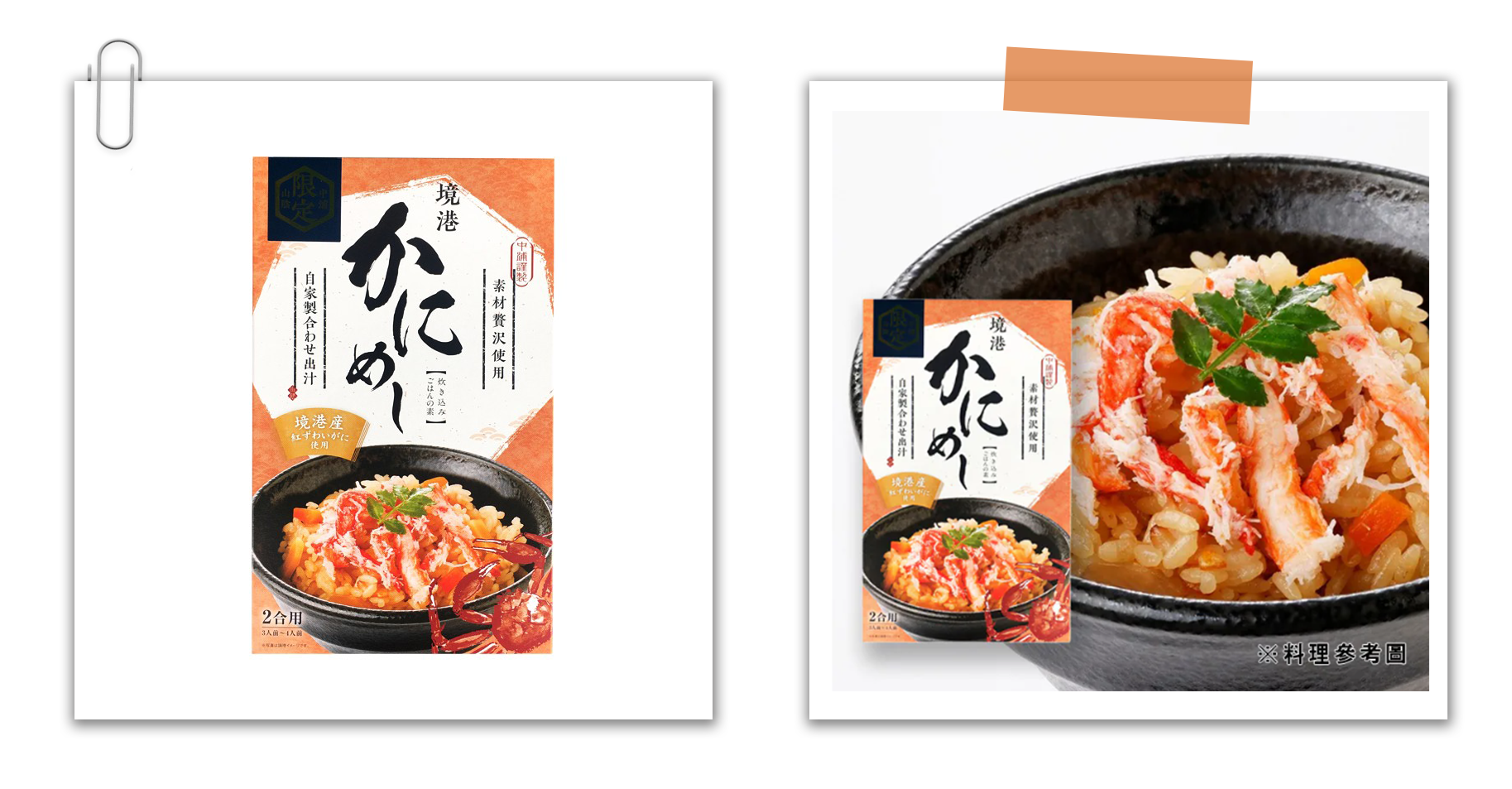 使用鳥取縣境港產的紅楚蟹製成的炊飯料理包,湯汁使用乾鰹魚片和昆布所製成的天然湯汁。使用電鍋,加入白米及炊飯調理包即可食用。