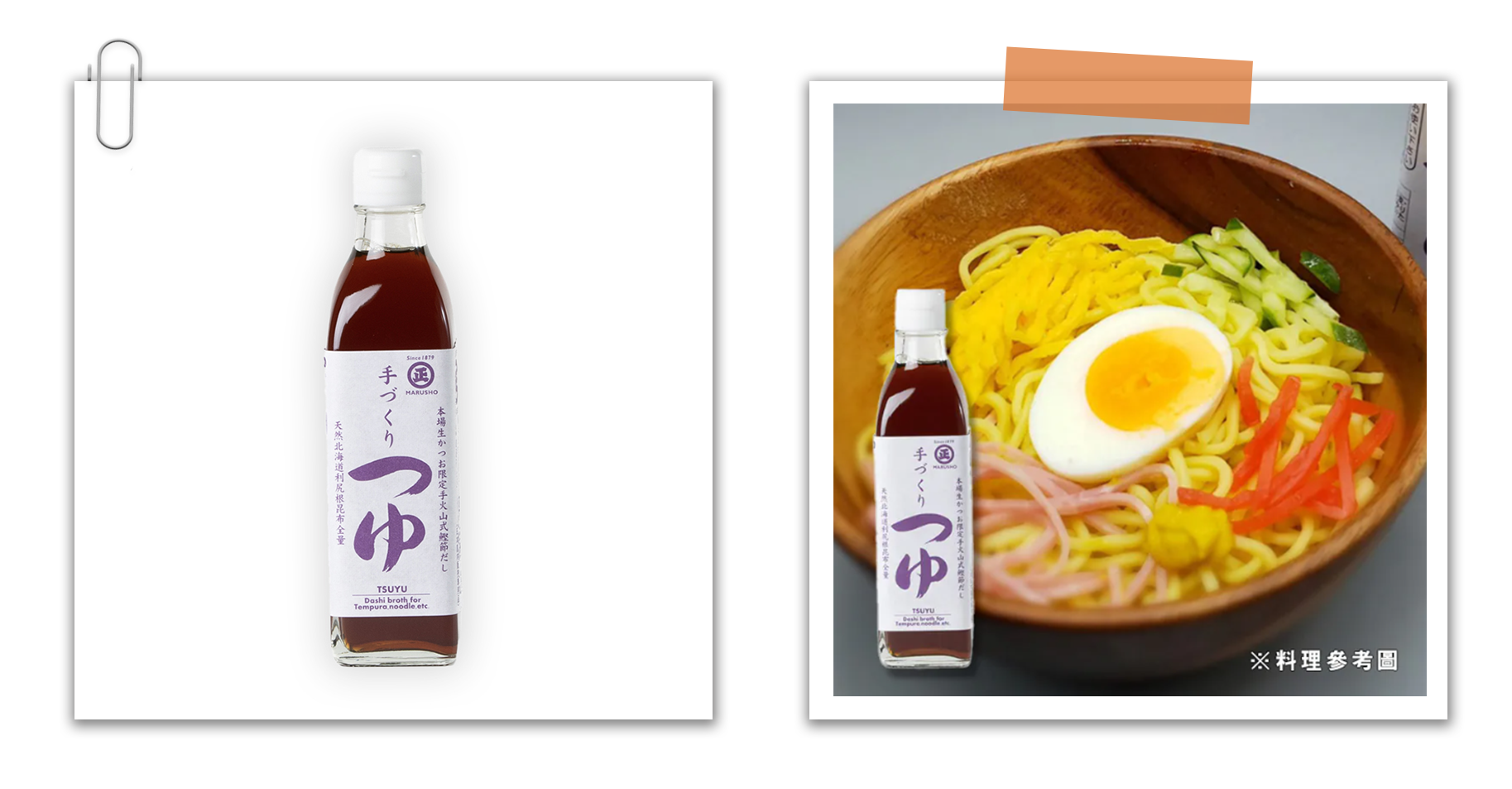 手火山式製法的鰹魚乾、原木香菇、天然利尻根昆布熬製的高湯而製的手工醬汁,不需再額外稀釋。可以直接用於涼麵、冷麵、天婦羅醬汁或煮物等。