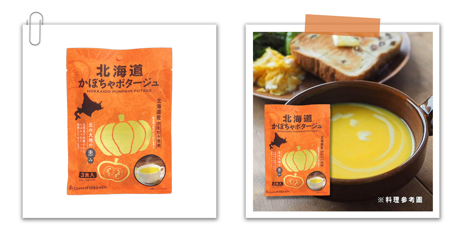 濃湯使用了大量北海道南瓜製成,不添加任何防腐劑,濃湯粉放入杯中,倒入150ml的熱水或是熱牛奶,仔細攪拌15秒後即可享用。