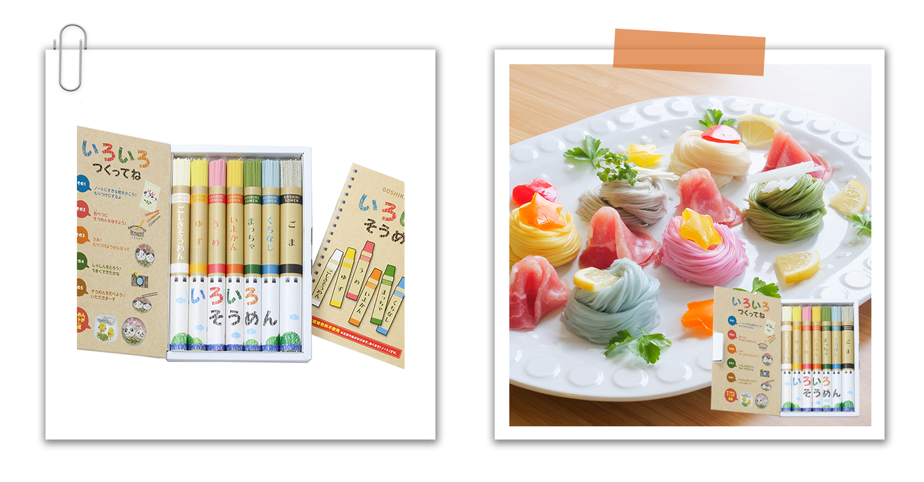 自然食材加入天然色素所揉製而成,基本款的白色麵線、柚子麵線、梅子麵線、伊予柑麵線、抹茶麵線、藍梔子麵線、芝麻麵線,色彩豐富的七色麵條,每一種顏色的麵線都有不同的風味。
