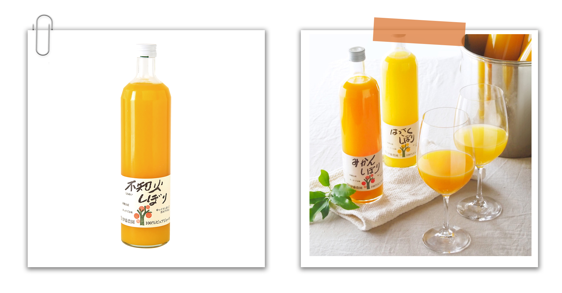 不含任何添加物,且不使用糖的100%原汁果汁!將日本第一的和歌山縣產的柑橘切成兩半,輕輕壓榨成汁,榨汁後立即冷卻,是伊藤農園獨特的技法。