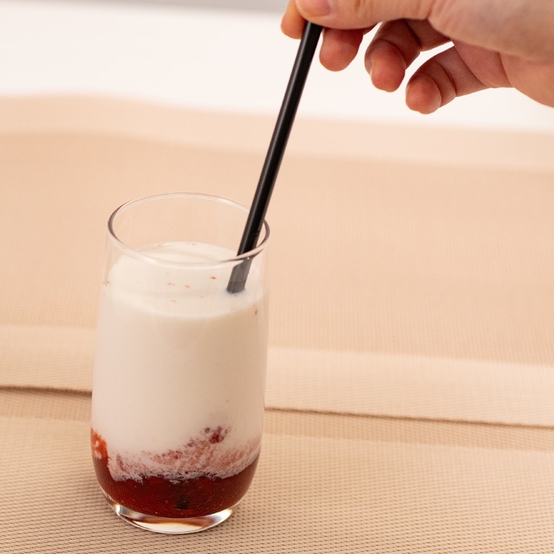 先按照食譜試試看吧~。首先準備好一杯200ml的冰牛奶,放入60g的草莓果粒醬,充分攪拌後就完成了♪