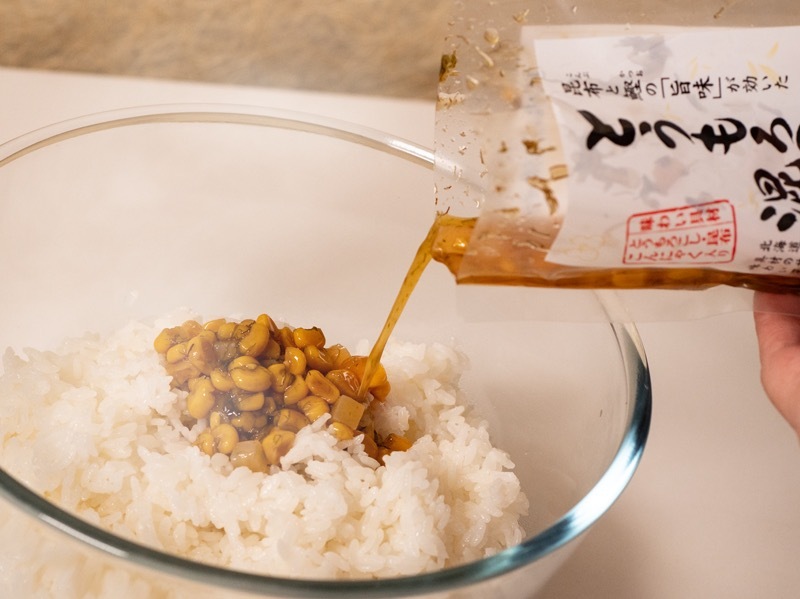 將一包「拌飯調理包」到入容器中,和白飯攪拌均勻。