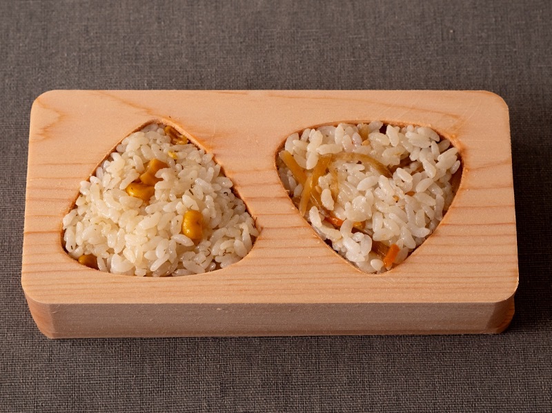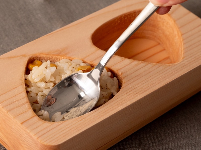 填滿之後,取出模具,如果飯粒黏在模具時,用湯匙背後從側面輕輕推擠一下,就能輕易取出。