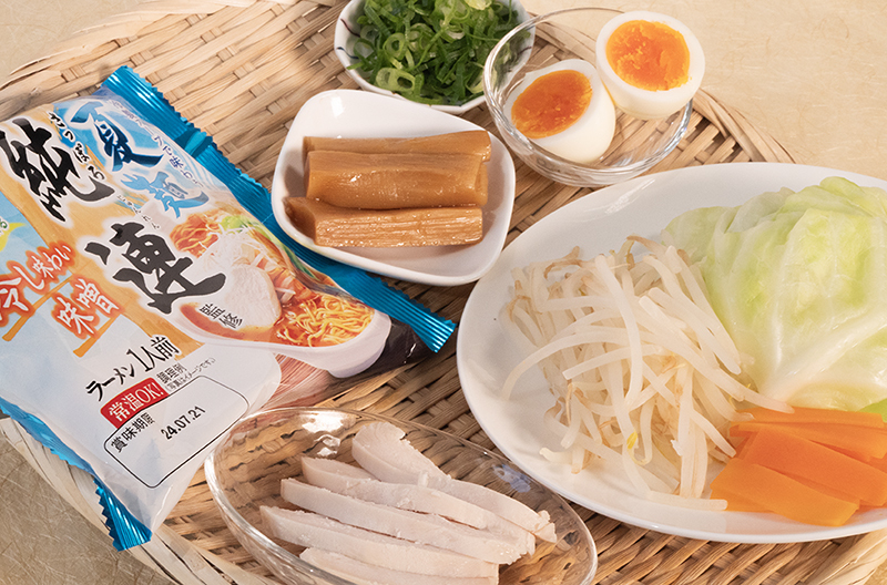 ★推薦使用食材:高麗菜、紅蘿蔔、豆芽菜、筍乾、溫泉蛋、蔥末、雞胸肉(可依照個人喜好調整)