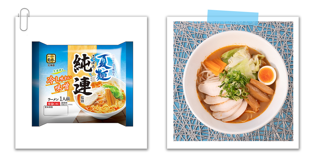 札幌濃厚味噌系名店「札幌純連」監修的商品。湯汁可以直接用冷水泡開,是一款適合在炎熱夏天食用的原創冷麵。