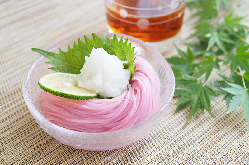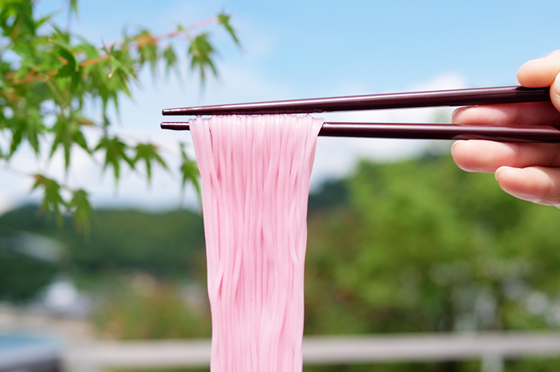 帶有淡雅春色的「梅子麵線」,是以愛媛縣松野町所產梅子的果肉揉入麵粉,再以手工拉製而成。麵條中帶有清爽梅香,口感滑順,讓人彷彿嚐到春天的氣息。