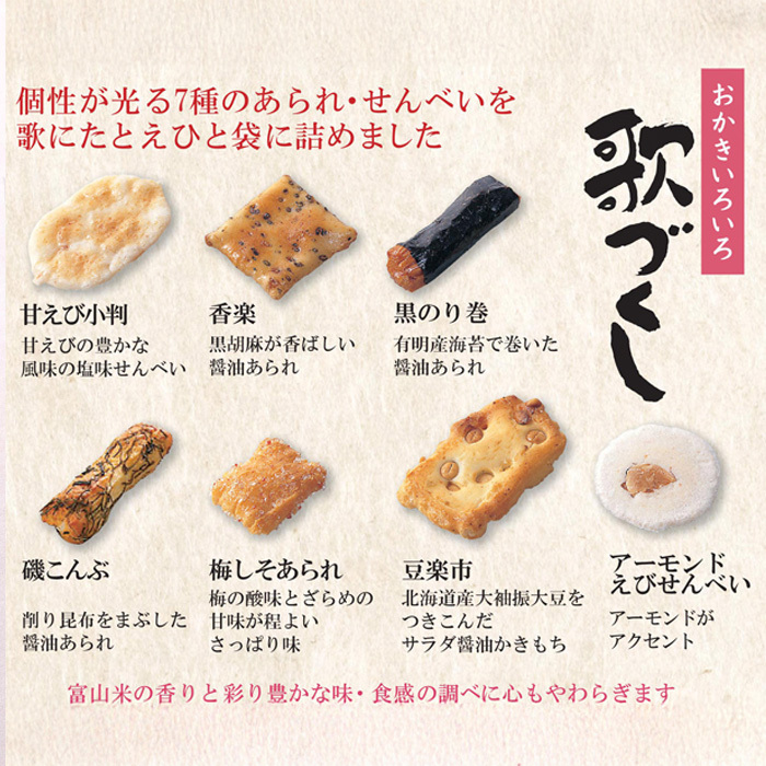 「歌づくし」是一款匯聚七種風味、各具特色的米菓綜合禮盒,內容豐富而講究。
