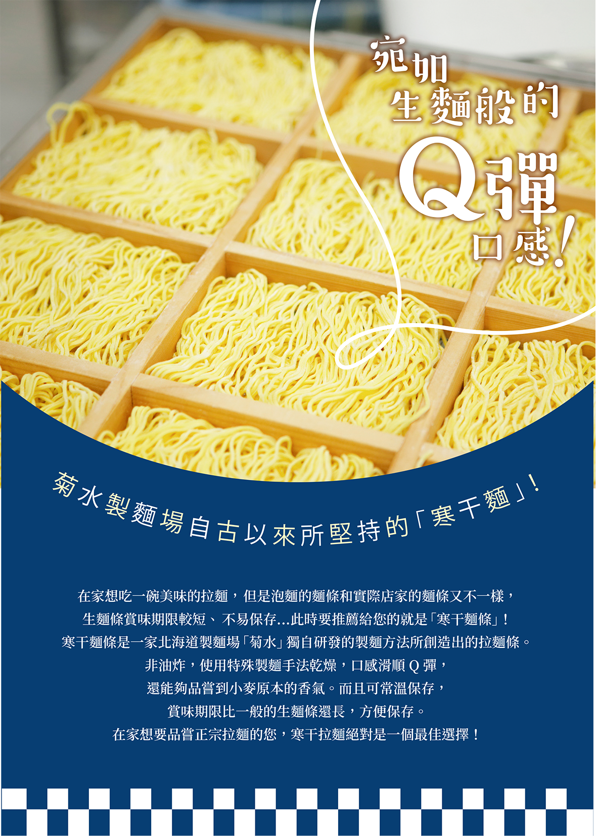 在家想吃一碗美味的拉麵,但是泡麵的麵條和實際店家的麵條又不一樣,生麵條賞味期限較短、不易保存…此時要推薦給您的就是「寒干麵條」!