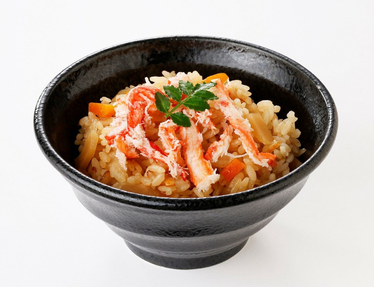 使用鳥取縣境港產的紅楚蟹製成的炊飯料理包,湯汁使用乾鰹魚片和昆布所製成的天然湯汁。