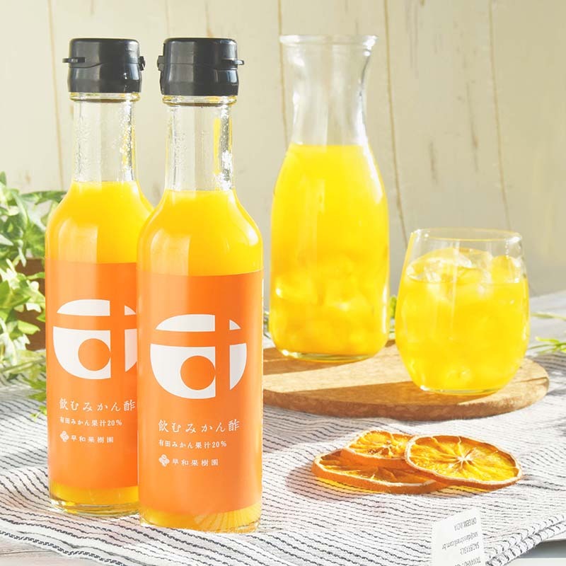 「飲むみかん酢」具有圓潤的口感,是一款使用100%有田蜜柑直接榨取的果汁和和歌山縣產的醋一起混合製成的無添加國產醋飲。除了直接飲用以外,也可以加水或是牛奶、酒精下去調製。促進代謝,增進身體健康機能。