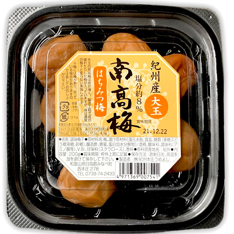大玉南高梅皮薄肉厚多汁,並且加入蜂蜜醃漬,具有溫和的甜味。對於想要帶有蜂蜜但不會過甜的梅干的人,這款產品是絕佳的選擇!梅干的酸味和蜂蜜的甜味達到了絕妙的平衡。鹽分約8%。