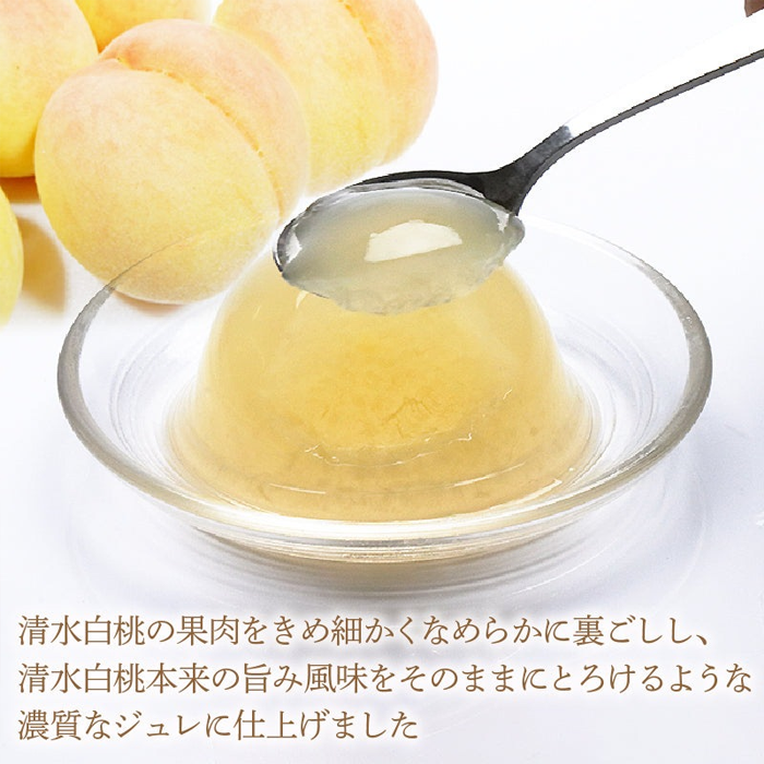 使用岡山名產「清水白桃」,將果肉細緻裏漉至綿滑質地,完整呈現白桃細膩的香甜與柔和香氣。入口即化、果肉感明顯,色澤自然,是一款充滿高雅桃香的奢華果凍。